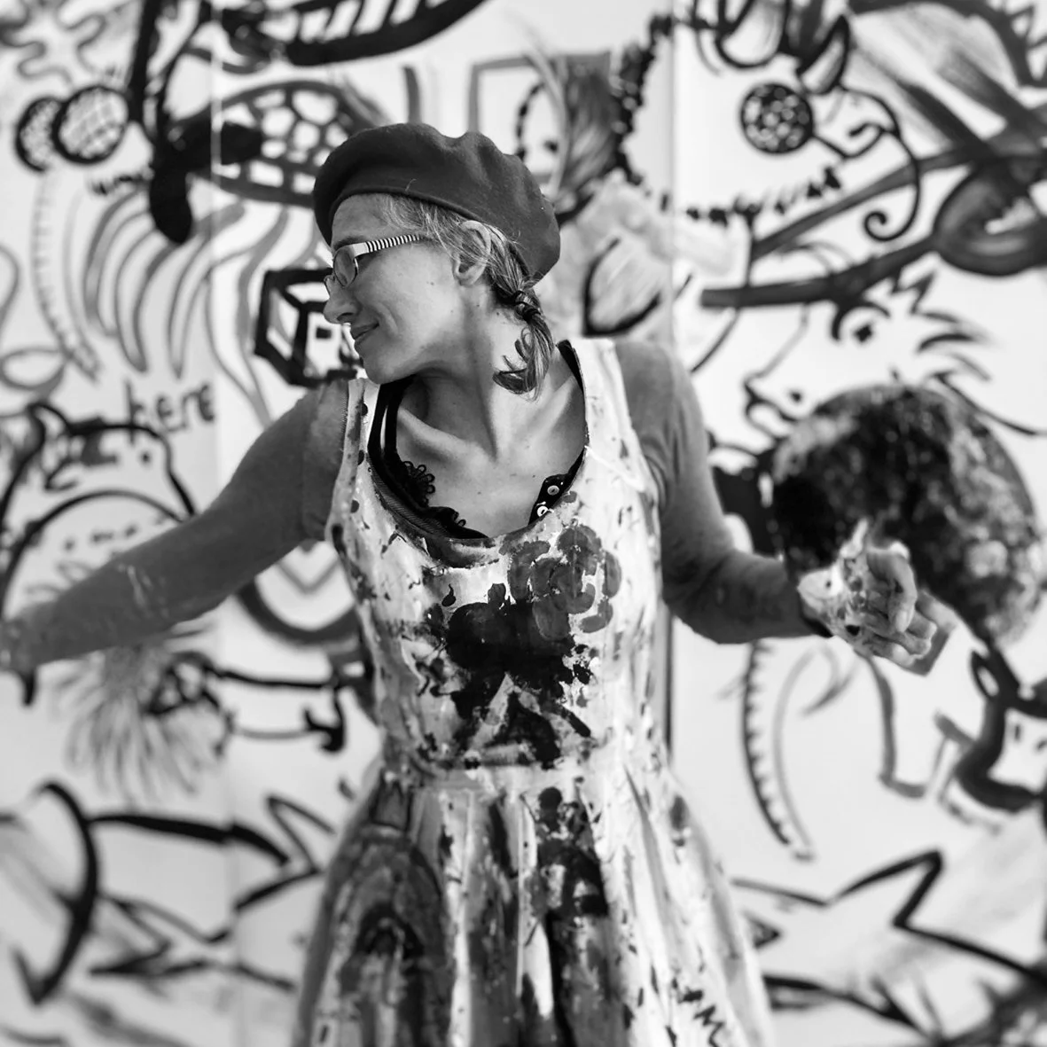 As well as painting large-scale murals and more serious subject matter, Nikki delights in drawing childlike images. Her charming dog illustrations in pen and pastel for HOPONIT have a vintage feel, with humour woven through each artwork.